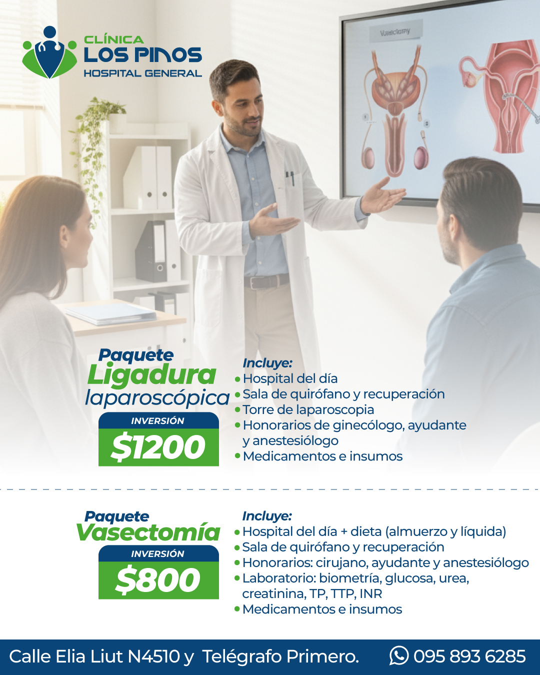 Decidir planificar de forma permanente es un paso importante para muchas familias en Quito. La vasectomía (para hombres) y la ligadura de trompas (para mujeres) son procedimientos quirúrgicos que ofrecen una solución definitiva para no tener más hijos. En Clínica Los Pinos entendemos que el costo puede ser una preocupación, por eso contamos con paquetes quirúrgicos accesibles que cubren todo lo necesario para que des este paso con tranquilidad y seguridad.